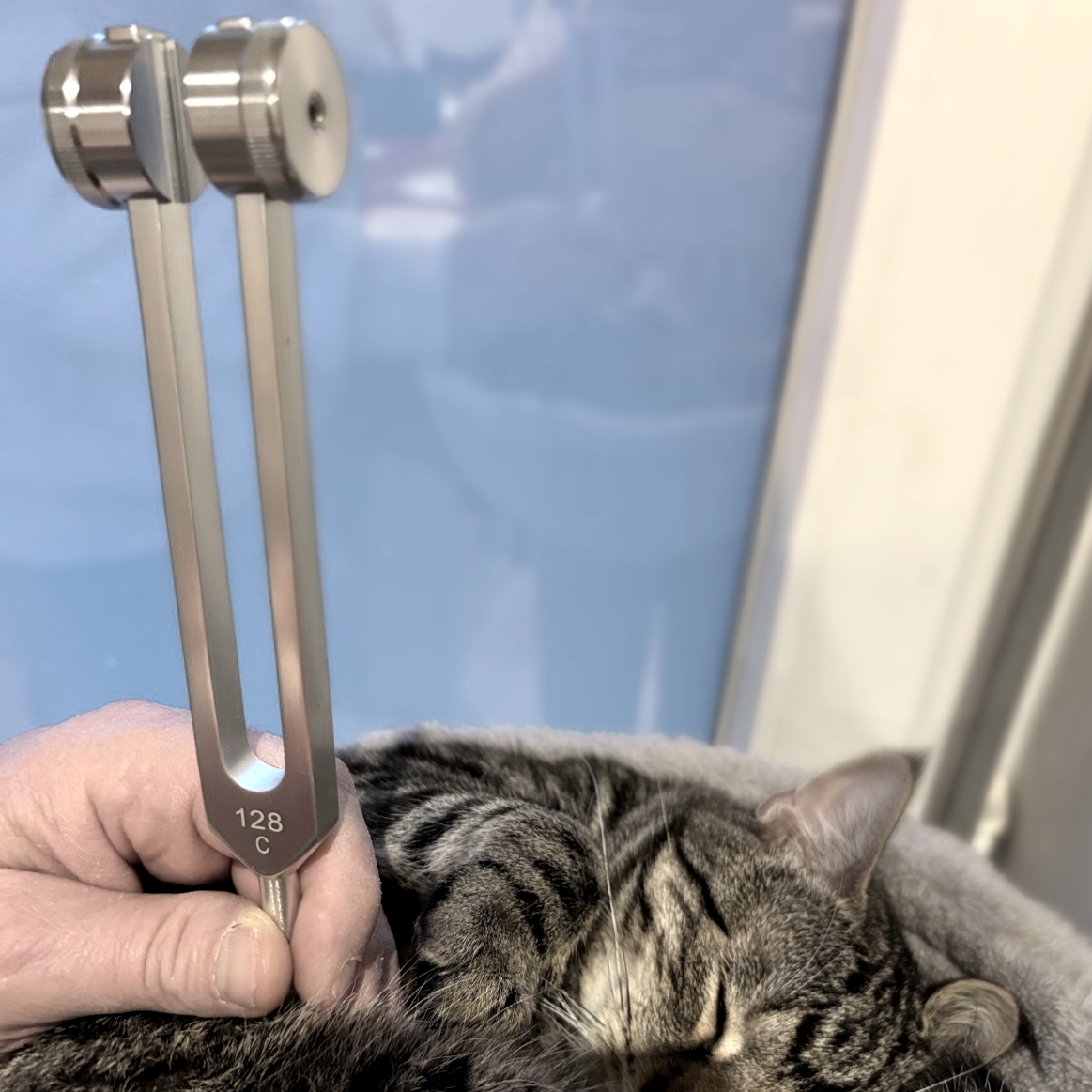 Notre praticien tient le diapason par son manche, le frappe sur un élément externe afin de le faire fonctionner puis le pose sur votre corps ou celui de votre animal.